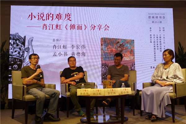 左至右為黃德海、肖江虹、李宏偉、孟小書 7月7日,電影《百鳥朝鳳》原著作者、小說家肖江虹攜最新作品《儺面》來到思南讀書會第253期的現場,與小說家李宏偉、《當代》雜志編輯孟小書、評論家黃德海共同探討小說寫作的難度,以......