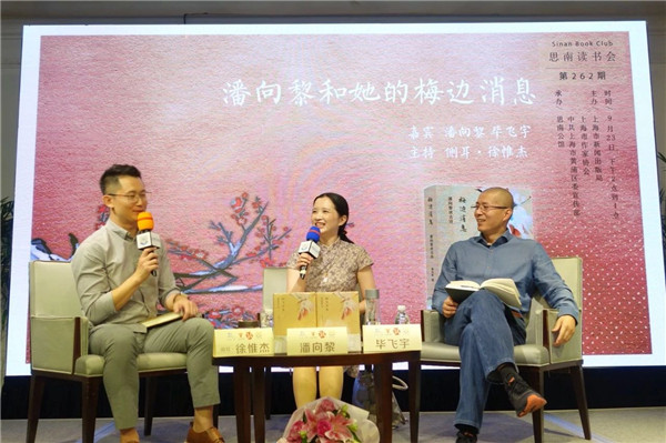 從左至右為徐惟杰、潘向黎、畢飛宇 9月23日下午,潘向黎攜其新書《梅邊消息:潘向黎讀古詩》,與小說家畢飛宇、SMG主播徐惟杰作客第262期思南讀書會,共同品茶談詩,在古典風景里觸摸現代人的心跳和脈搏。 “化”而入詩 在書序《......