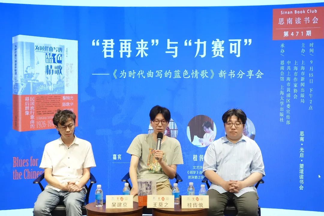 從左至右為吳建京、王莫之、桂傳俍 9月15日下午,作家、樂評人王莫之攜其首部非虛構作品《為時代曲寫的藍色情歌》與《萌芽》雜志社副主編桂傳俍、音樂制作人吳建京做客思南讀書會第471期,與讀者一同回望時代曲,品味老歌中沉淀......
