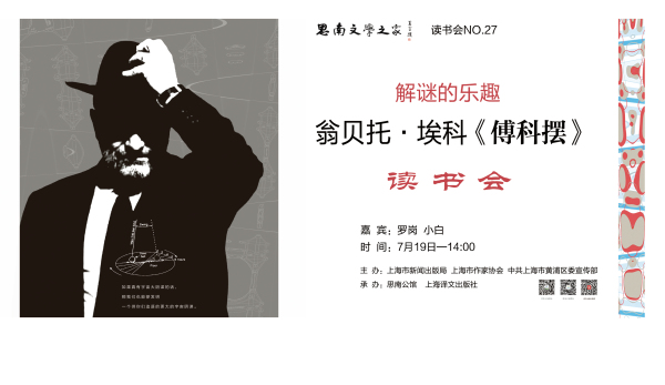 思南讀書會NO.27 主題:解謎的樂趣——翁貝托·??啤陡悼茢[》 時間:7月19日(周六)下午2:00-4:00 地點(diǎn):思南文學(xué)之家(復(fù)興中路505號) 嘉賓:羅崗、小白 世界是一個無傷大雅的謎團(tuán),是我們的瘋狂使它變得可怕,扣人心弦的解謎歷險......