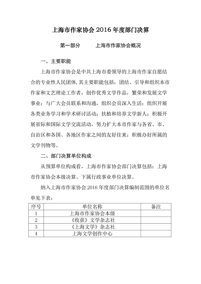 第一部分 上海市作家協會概況 一、主要職能 上海市作家協會是中共上海市委領導的上海市作家自愿結合的專業性人民團體,其主要職能包括:團結......