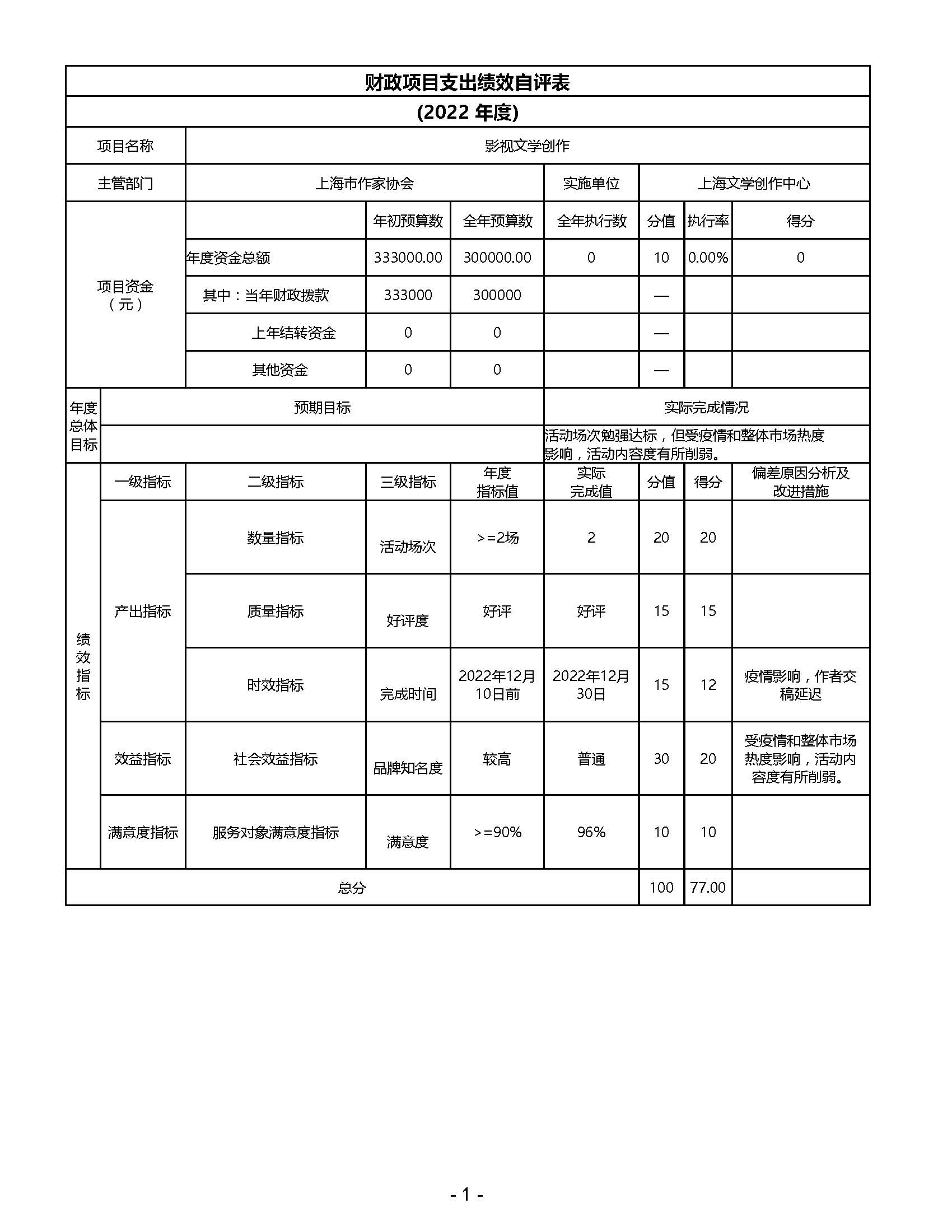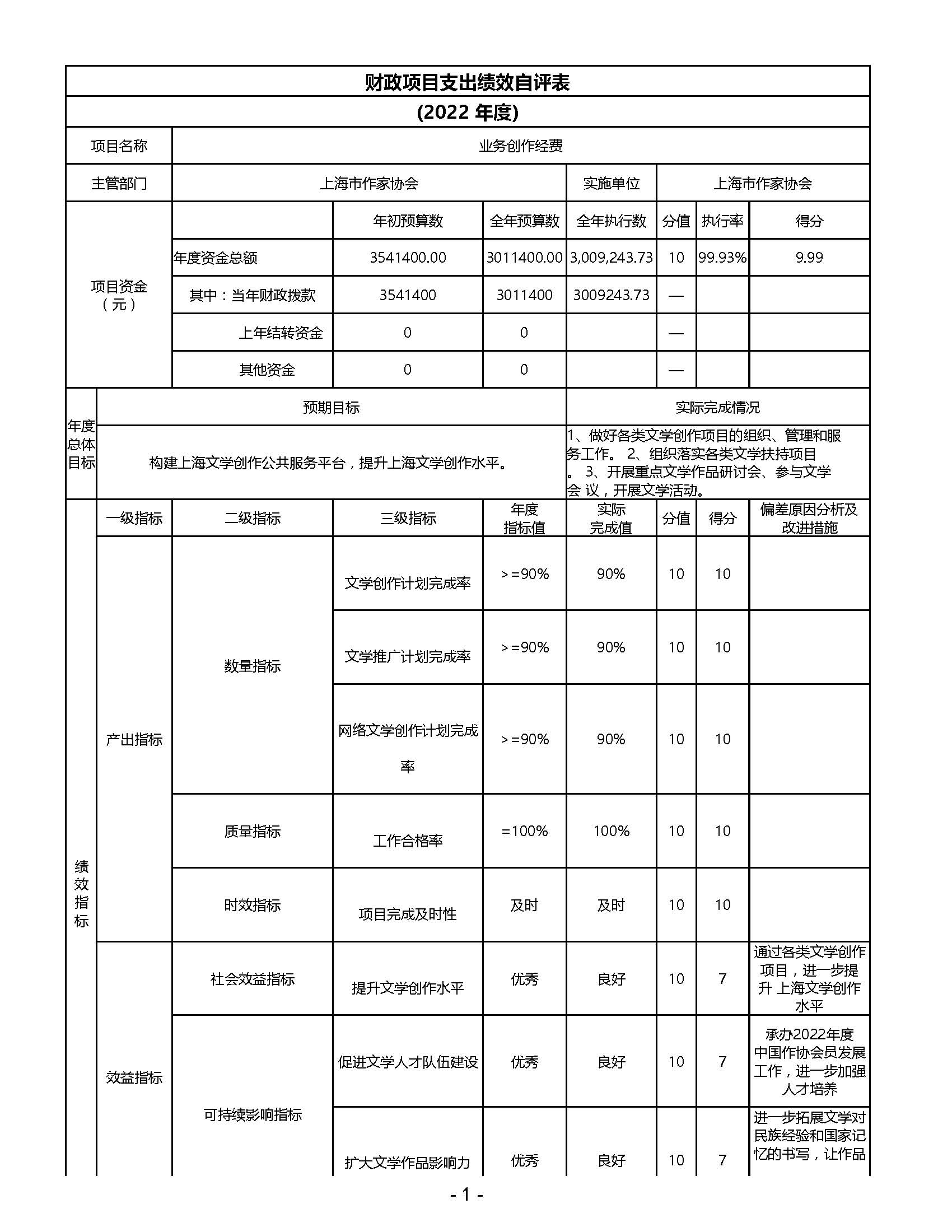 上海文學(xué)創(chuàng)作中心2022年度項目績效自評價表
