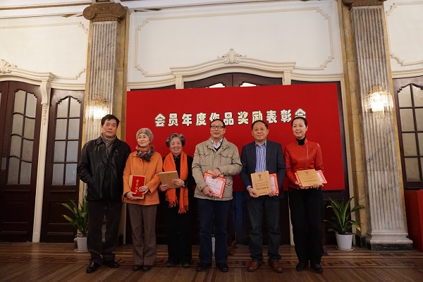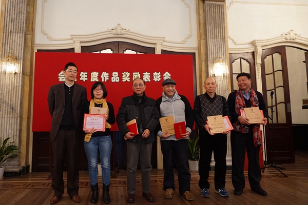 (圖為上海作協(xié)副主席楊揚(yáng)為理論古典類獲獎(jiǎng)?wù)哳C獎(jiǎng),左起:楊揚(yáng)、項(xiàng)靜、沈鴻鑫、陳???、田全金、張錦江)
