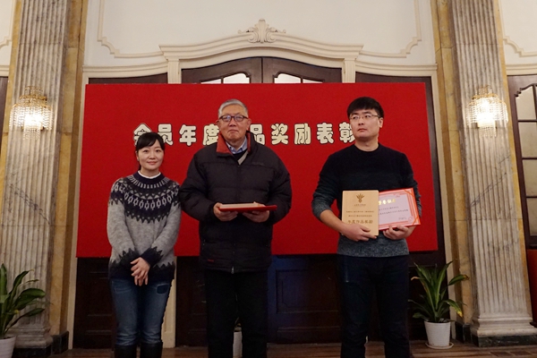 (圖為上海作協(xié)黨組副書(shū)記、秘書(shū)長(zhǎng)馬文運(yùn)為影劇類獲獎(jiǎng)?wù)哳C獎(jiǎng),左起:馬文運(yùn)、管燕草、李莉代領(lǐng)者)