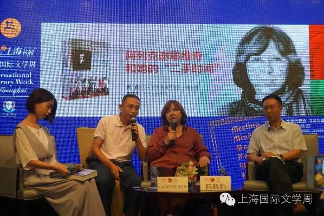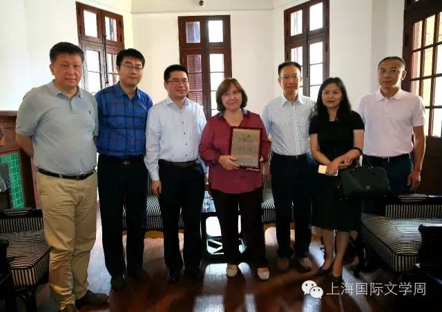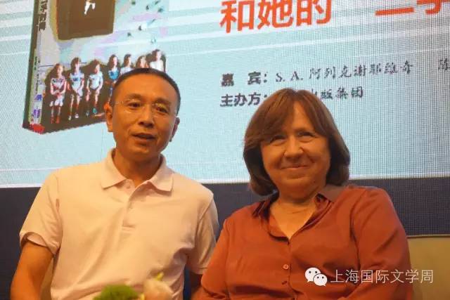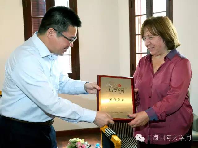 阿列克謝耶維奇來到思南文學之家貴賓廳,接受由上海出版局局長俆炯、市作協副主席孫甘露向她頒發的《上海書展榮譽嘉賓》證書,徐炯說:“這是上海書展13年來的第一次頒發,阿列克謝耶維奇也是獲此證書第一人。”