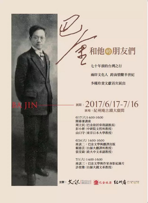 主辦各方為了配合本次展覽還組織了關于巴金先生的系列講座,第一場講座定于2017年6月17日下午展覽開幕式后舉行,嘉賓分別是巴金故居常務副館長周立民,“中研院”文哲所教授彭小妍、東京日本大學教授山口守,講座主題將圍繞巴金先生和他朋友們的友情交往展開,回看那個年代,那代人經過各種人生遭遇后依然對友情的堅持和追求。第二場講座定在6月24日下午,講座嘉賓是臺師大翻譯所的教授賴慈蕓和政大中文系副教授張堂锜,講座主題是《巴金文學與翻譯出版》。最后一次講座將于7月1日下午舉行,嘉賓是臺師大國文系教授許俊雅,許教授的講座題目是《巴金文學與作家身影紀錄片》。