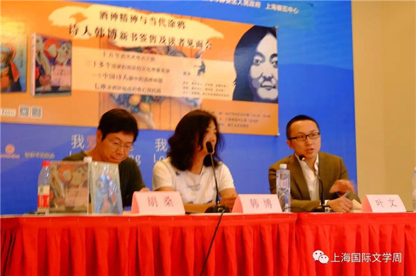 8月16日下午14:30的“酒神精神與當代涂鴉”讀者見面會,嘉賓有韓博、胡桑、葉文。