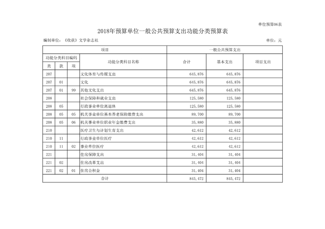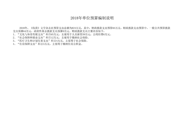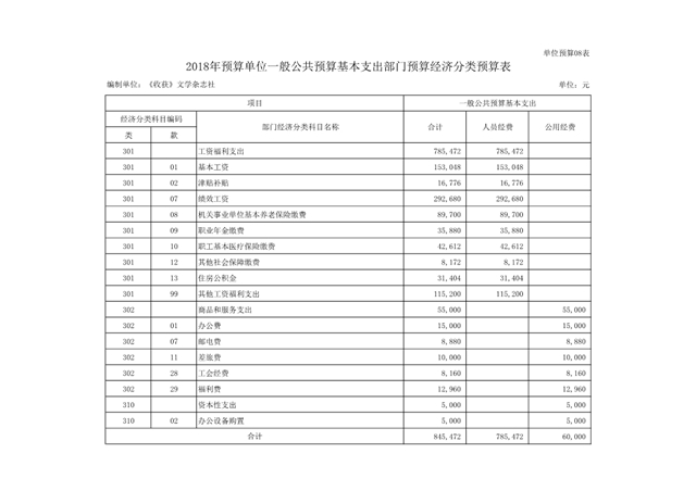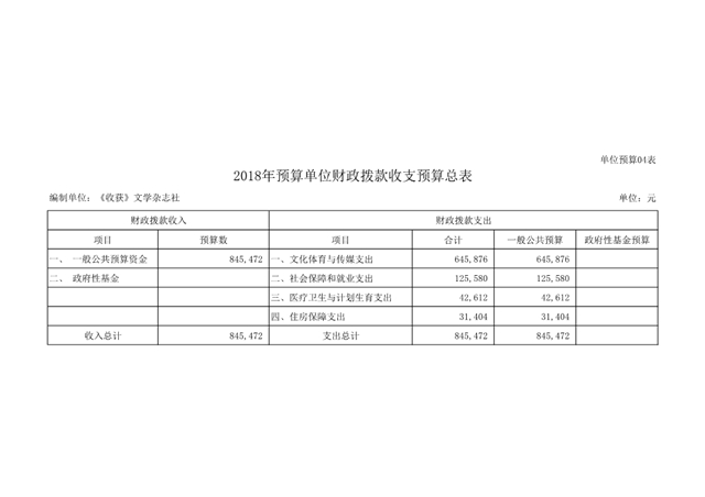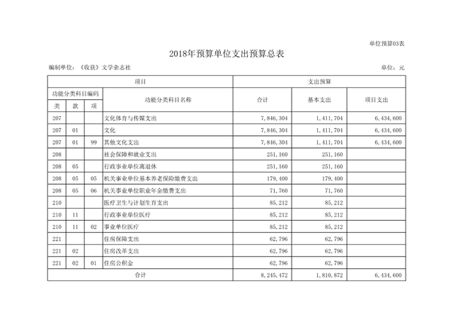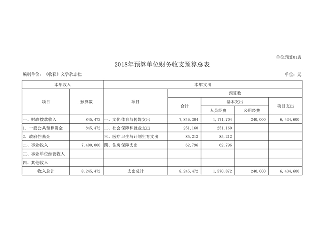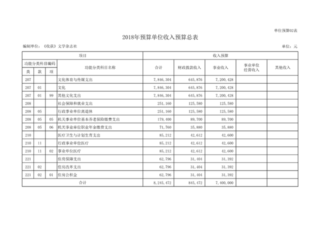 《收獲》文學(xué)雜志社2018年度部門預(yù)算
