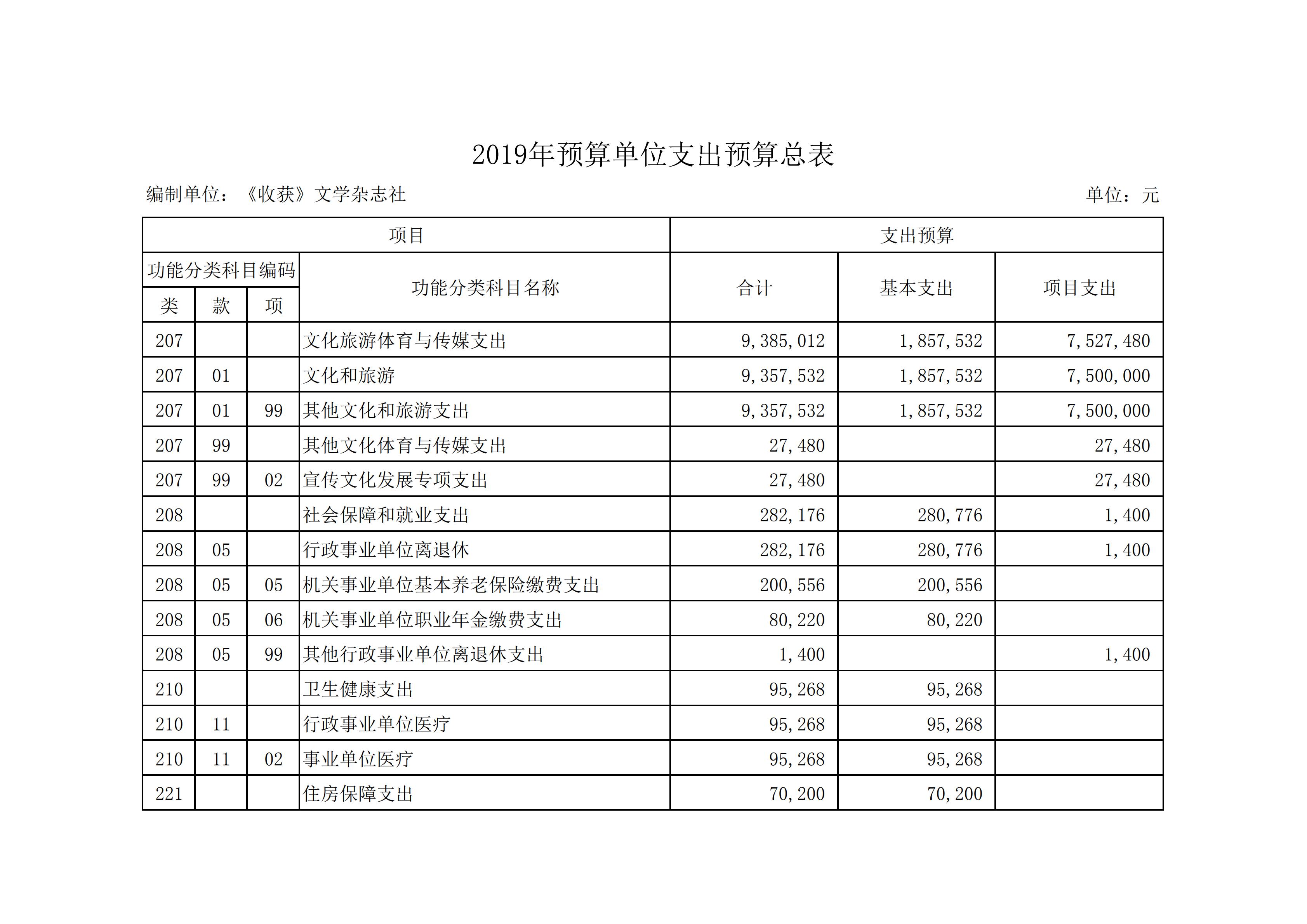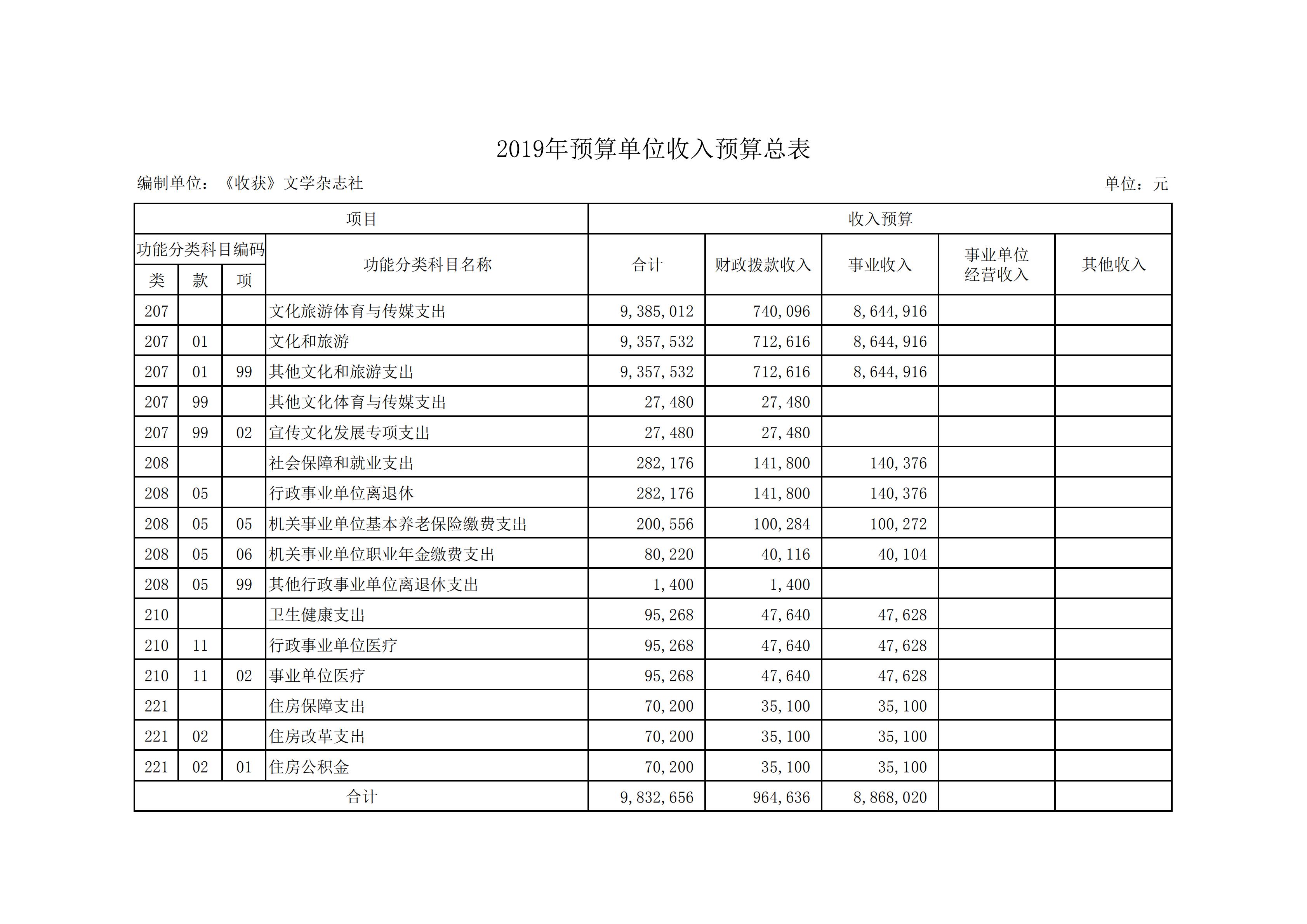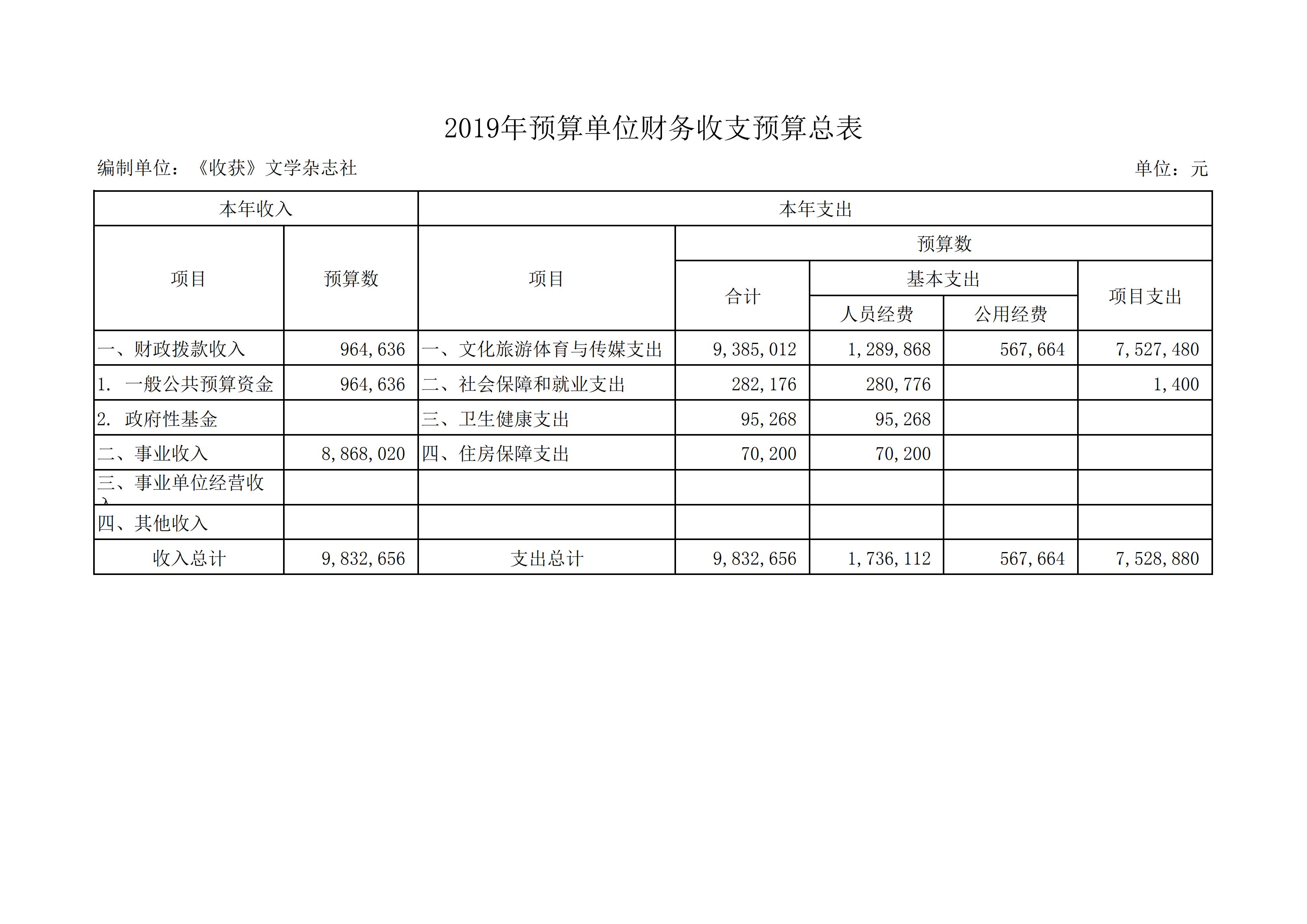 《收獲》文學(xué)雜志社2019年度預(yù)算