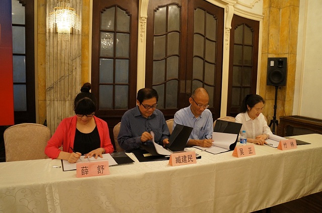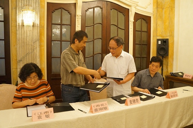 華語文學網總監麥穗奇與《江南》主編袁敏、《雨花》主編姜琍敏、《上海文學》社長趙麗宏等刊物代表簽約。