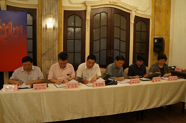 華語文學網總監朱益明與王為松(上海人民出版社總編輯)、郟宗培(上海文藝出版社總編輯)、褚水敖(上海詩詞學會會長、社團代表)、蔡駿(入駐文化機構代表、浩林文化傳播有限公司)、亢培琳(入駐企業代表、東方網印總經理)簽約。