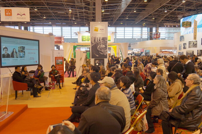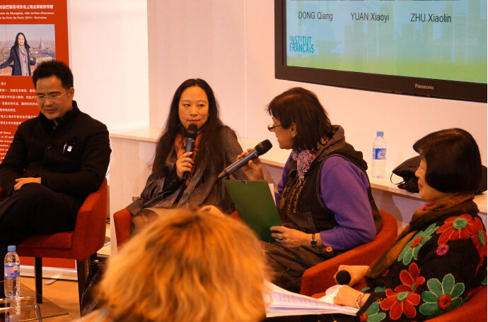 2014年3月24日下午,上海作家代表團里的兩位法文專家袁筱一、朱曉琳在巴黎圖書沙龍上與董強對談《法國文學(xué)在中國》。原以為這是巴黎圖書沙龍的最后一個下午,讀者會很少,但是出乎意外的是熱情的法國讀者依然是濟濟一堂,踴躍參加。對談會還與讀者提問互動,并為讀者簽名售書。