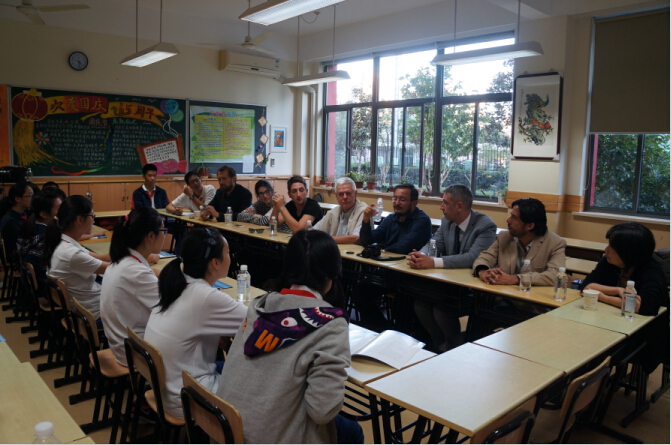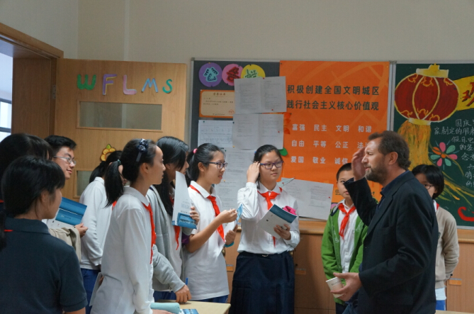 在六年級的教室里,作家和同學們圍坐一圈,討論了一些同學們關心的問題:“人與死亡”、“英語與寫作”、“文學與翻譯”。阿根廷作家維多利亞對同學們小小年齡卻對哲學問題進行思考表示非常欽佩,擅長精神和心理分析的青年匈牙利小說家彼得也現身說法,并給予同學們更多的鼓勵。