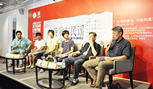 本屆文學周的特別單元活動“詩歌與民謠”在思南文學之家舉行。本場活動由樂評人孫孟晉主持,詩人臧棣、王小龍,與音樂人萬曉利、莫西子詩、堯十三展開對談,講述詩歌與民謠的共性和不同之處。