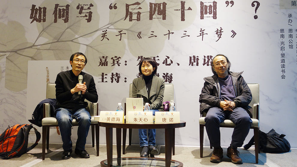 此次對談主題為“如何寫‘后四十回’ 關于《三十三年夢》”,意思是《三十三年夢》的寫作好比是《紅樓夢》中后四十回的敘寫。朱天心承認,和年輕時創作的《擊壤歌》這類天真爛漫的作品相比,后四十回的寫作一點都不美好,因為“寫東西的人永遠是非常不滿現實的,盡管它非常強大、非常逼人,你不愿意馴服,你會跟它角力,甚至會輸給它。”這種不美好包括很多方面,比如“你的好朋友們,你在生命過程的每個階段非常珍視的朋友,有些本來跟你在一條跑道上,卻跑到另外一條人多的路上,種種,都不是這么美好的。”唐諾則認為這種不美好還包括隨著年齡的增長,在書寫里很難保持年輕時候的干凈、清爽、純凈,“你會覺得更多真實的部分跑了進來,人會衰老,有些東西會變化,有些東西會過去,一切事實都變得脆弱不堪。”