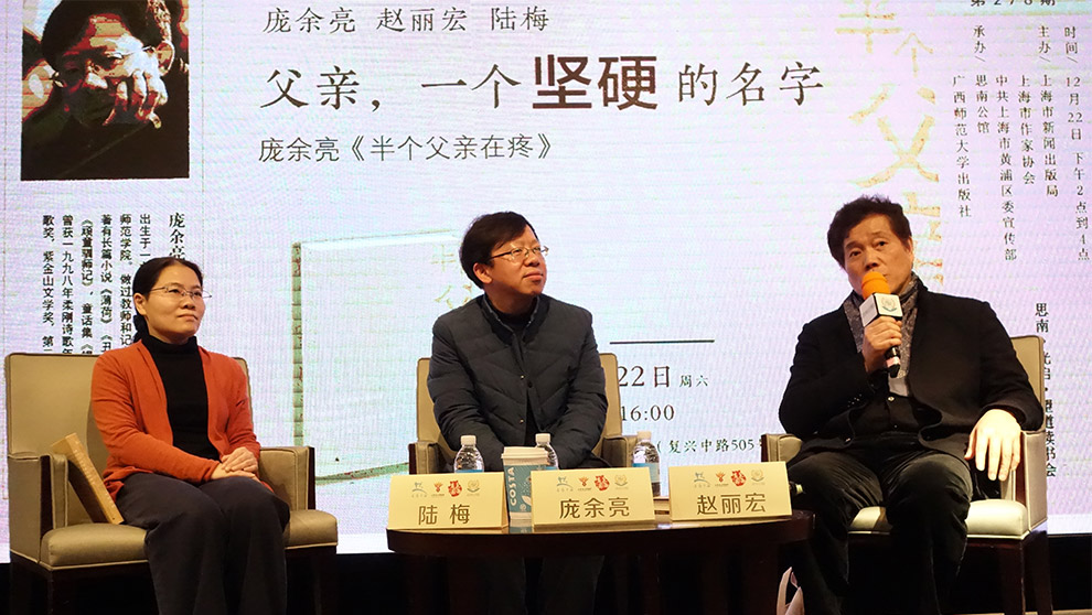 《半個父親在疼》深情地記錄了龐余亮對父母的回憶和個人的成長體悟。書名來自于生活中那個粗暴的、不可愛的父親形象。所謂“半個”,龐余亮解釋道:“我的父親癱瘓在床,從生理意義上是半個。從另一個角度來說,他沒有做好做父親的準備,匆匆地做了父親。”趙麗宏表示,書中的父親形象是粗暴的、野蠻的、不可違抗的。也正因為此,書中展示的是一種不同于以往閱讀體驗的父愛。龐余亮的童年是在父親的打罵中度過的,經常受到來自父親的威脅。面對這樣一個父親,其他兄弟都在成家立業后選擇了逃避,而龐余亮選擇陪伴在父親的身旁。“孝”在他的身上表現的獨特又深沉。龐余亮也表示,并不是暴力導致了孝。困窘的生存條件讓父親選擇了暴力的教育習慣,而自己則偏向了“歷史的鐘擺”的另一端,成為了一個性情溫和的人。