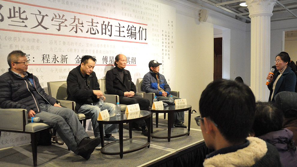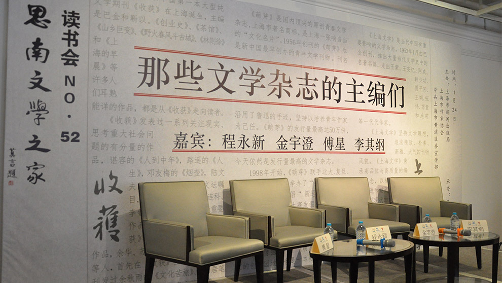 2015年1月24日下午兩點,思南讀書會第52期“那些文學(xué)雜志的主編們”準時在思南文學(xué)之家舉行。《收獲》雜志執(zhí)行主編程永新、《上海文學(xué)》雜志常務(wù)副主編金宇澄、《萌芽》雜志執(zhí)行主編傅星、李其綱齊聚一堂,來談一談他們在文學(xué)雜志中做主編的感悟,與現(xiàn)場讀者分享了工作中的一些小故事。本次活動由讀書會策劃人之一王若虛擔任開場主持。